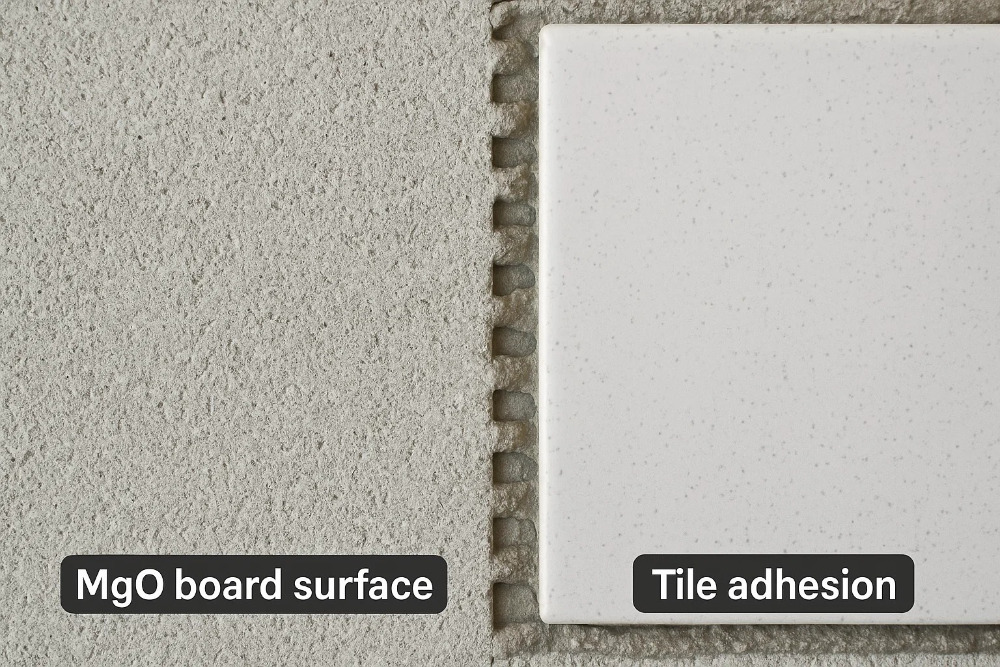 Soláthraíonn an dá bhord dromchlaí den scoth le haghaidh greamaitheachta tíleanna. Tá an príomhdhifríocht sa mhodh. Ligeann nádúr póiriúil an Bhoird Stroighne moirtéal tanaí a chur le chéile go meicniúil de réir mar a leigheasann sé isteach sa dromchla. Molann roinnt monaróirí an dromchla a chur chun cinn chun ionsúiteacht a laghdú agus chun cosc a chur ar an tacar tanaí a thriomú go gasta, rud a fhéadann an banna a lagú. Soláthraíonn dromchla réidh, dlúth bhord MGO banna ceimiceach cumhachtach le tanaí tanaí, ag cinntiú go gcloíonn tíleanna go daingean agus go maireann siad ar feadh na mblianta.